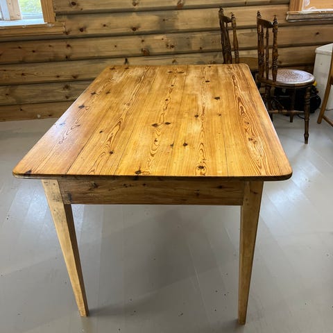 Flott spisebord i heltre bjørk. Gammelt og hjemmelaget. Skal kunne trekkes ut, men "mekanismen" fungerer ikke. Kan sikkert repareres! Selges fordi vi trenger et bord som kan trekkes ut.