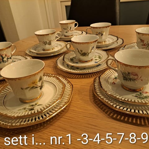 Utrolig pen, elegant servise. Selges som kurvet sett eller hele servise til 6 personer. Hvert kurvet sett har et rikt detaljert håndlitografert motiv av en vakre vårblomster og er håndmalt med 24 karat gull. Alle delene er i veldig god stand. Kan pakke veldig godt og sende med post nord for 69 kr extra porto eller fix ferdig. PRIS per sett 250 kr. Liten skål -100 kr, sukker skål - 150 kr. Hele servise selges for 1400 kr. Norsk navn: Nmr 1.-Steinbalsam. 2-gjøksyre. 3-mars fiol. 4-bitterberg knapp. 5-pinse nellik. 6-storarve.