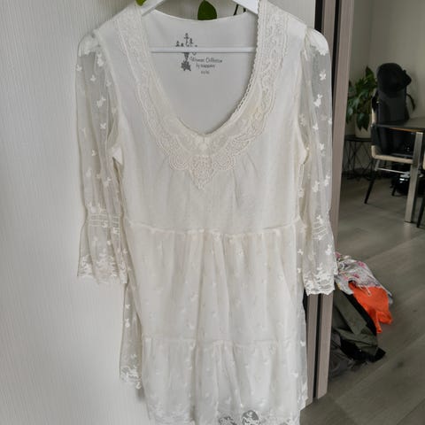 Nydelig bluse fra Blanco i boho-stil fra Blanco i str.M. Blusen har heklede og broderte detaljer, elastisk strikk i livet. Laget av 100% viskose. En liten svart flekk bak på det ene ermet, ikke så synlig. Kan sende 🌿