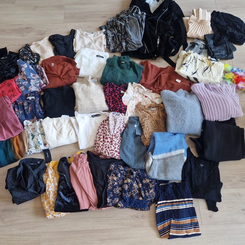 Stor klespakke med hovedsaklig topper og korte shortser i str M. Noen kjoler.