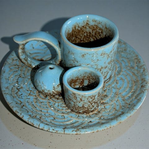 Fint sett i tre med serviettholder og tannpirkebeholder. Serviettholderen er 31 cm høy og har plass til 10 servietter. Tannpirkebeholderen er 6 cm høy. Laget av Lars Evensen, Moelv.