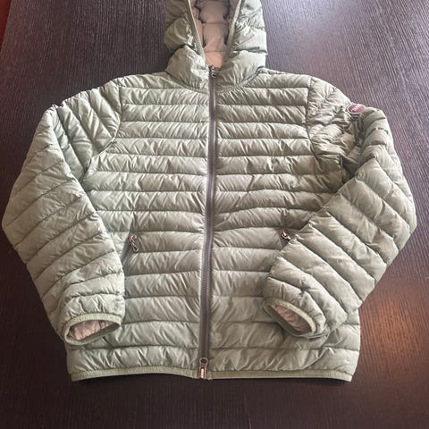Lett fin og grønn dunjakke fra Cubus str 146. Se bildet for et par små flekker foran ved glidelås og den ene mansjetten har sklidd litt ut fra sømmen.