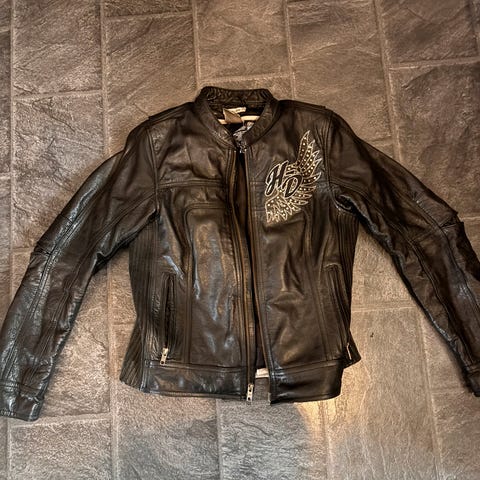 Lekker Harley Davidson damevest, helt ubrukt, i str. XL (tilsvarer ca str. 44). En del av original kolleksjon med veldig fin utførelse - skinn i alle detaljer. Litt vattert slik at den hjelper til å holde på varmen:) Jeg kan sende varen med posten.