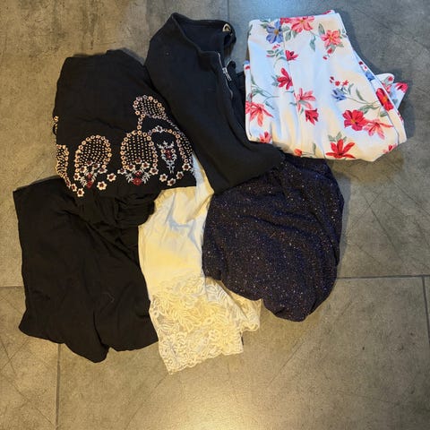 Fine topper i størrelse xs og s. En playsuite i 36. Ingen bruksmerker som eg kan se, noe med lappen fortsatt på