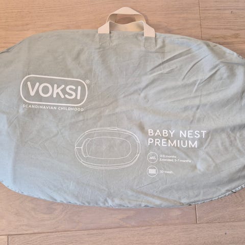 Voksi Baby Nest med oppbevarings trekk, lys blå og grå. To steder er stoffet reparert med noen sting, se bildet 6. ellers meget pent brukt og ingen «søle merker»