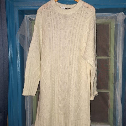 Pent brukt bomullstunika, hjemmestrikket. Dempet, dyp turkis farge, nydelig hullstrikk i bole og kanten nede. Litt stor til meg, er 44, så passer enten 44/46 eller 46 tror jeg. Ca 61 cm fra underarm til underarm. 73 cm fra øverst på skulderen og ned