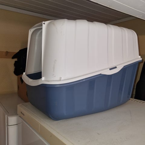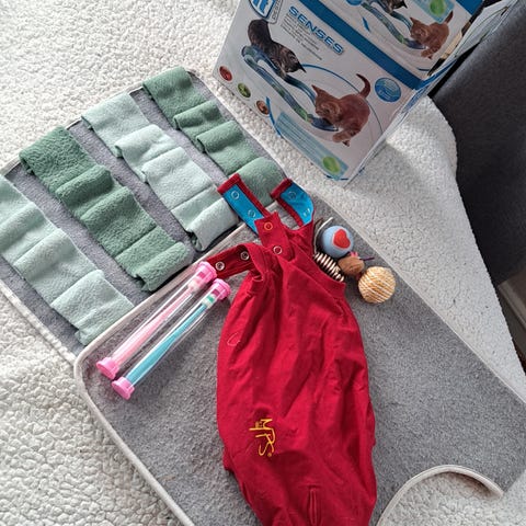Klorematte, mat&vannskål, 2 halsbånd, 1 vanlig bånd, masse leker (den blå går på batteri og har fjernkontroll).