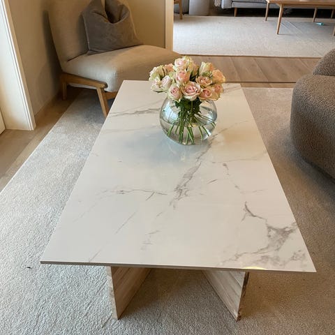 Kjempe fint stue bord med eikebein og flis med marmor designe. Helt nytt.