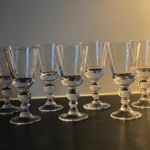 6 elegante glass med seilskutemotiv. Ingen skår. H=12,5 cm. D=7,5 cm åpning.