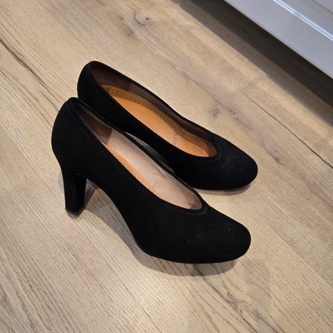 Brukt kun en gang inne, noen bruksmerker, men de synes ikke når man har på skoene. Høyde 8 cm, passer bredde føtter.