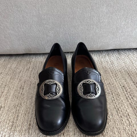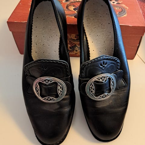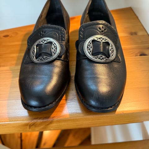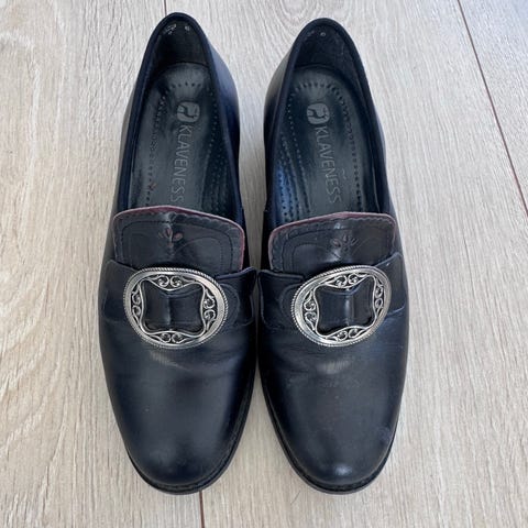 Klavenes Britt bunadsko str 38.5 (str 5.5), men som tilsvarer str 39. Se screenshot fra Eurosko sine sider om romslig i størrelsen. Nypris 1900 kr. Solid kvalitet. Svært pent brukt, såvidt en liten skrape på venstre tupp som ikke er synlig i bruk. Selges fordi jeg gikk opp til str 40 etter graviditet og de er litt i minste laget nå.