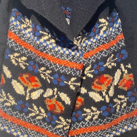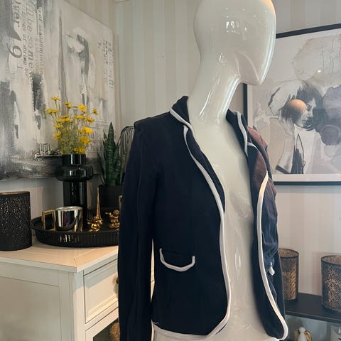 Lekker strikket damejakke i maritime tysk design med exclusive detaljer i front knapper og side lommer, i marineblå og eggeskall frg. Foret i marineblått. Jakken er helforet. Kvalitet: 8%silke, 52%lammeull, 40% polyacryl. Foret er i 100% viskose.Jakken er brukt kun en gang da den dessverre har blitt for liten for meg. Se bildevisning. Frakt kr 140.- tilkommer