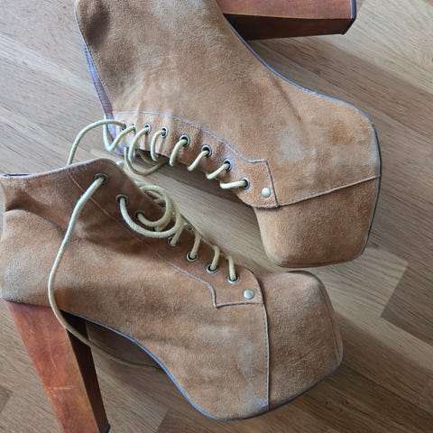 Ca 12-15 cm hæl, men føles ikke sånn pga plattform under foten.