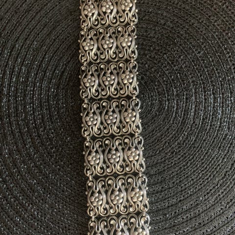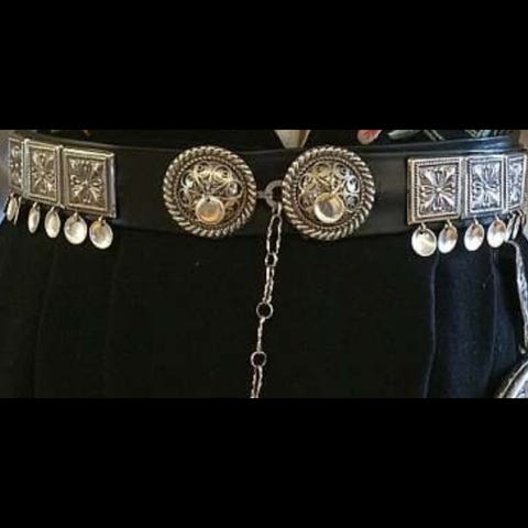 Fint enkelt eldre belte i sølv selges. Har vært brukt på en bunad, mulig den første utgaven av Follo bunaden. 97 cm langt