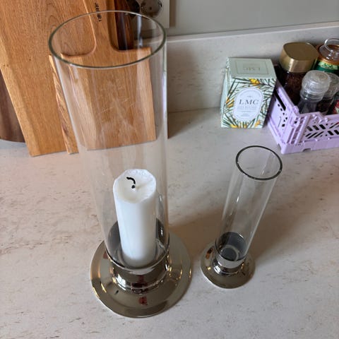 Flott lyslykt i glass og tinn fra Hadeland Tinnstøperi. Høyde 23,5 cm og dia på fot er 13 cm.