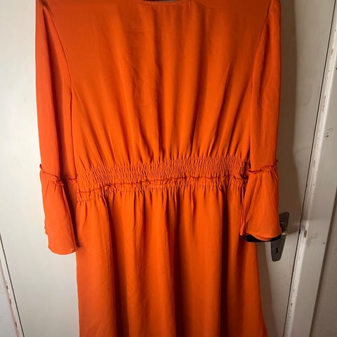 Oransje kjole i str. 44 fra H&M selges til fastpris kr. 50. Kjolen har strikk i livet, og trekvart lange ermer. Den når meg (168 cm) til rett over kneet. Lite og pent brukt, ingen hull eller flekker.