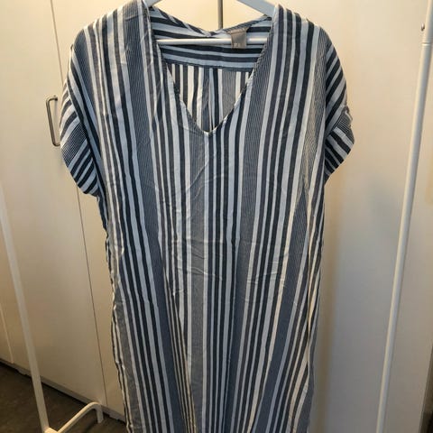 Ubrukt, tynn og behagelig kjole i viskose, lin og bomull med 2 lommer selges. Blå/hvit stripete. Kyra & Ko. Sendes eller hentes i Aurskog eller på Jessheim.