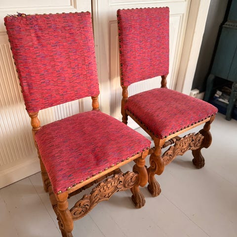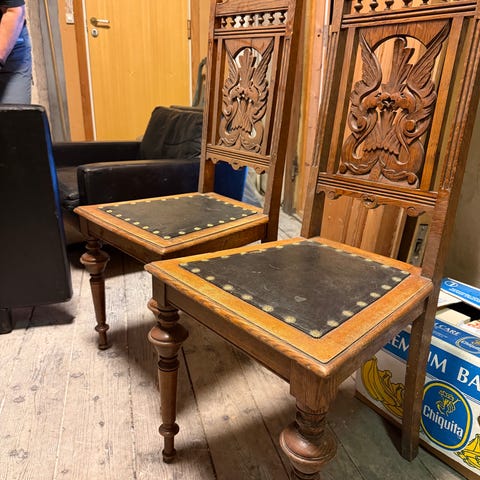 2 stk Antikke utskårne stoler. Kr 1000 pr stykk. Kan selges hver for seg.