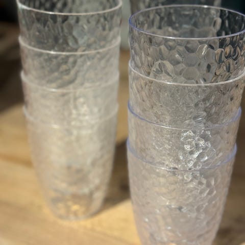 Fine plastglass selges. Noen er brukt en gang, mange er ubrukt.