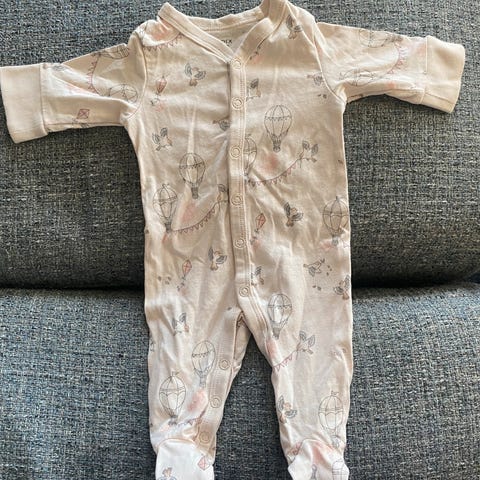 Pent brukte omslagsbodyer i str 44. Det er to rader med knapper nede på bodyene som gjør at de kan brukes lengre og «vokser» med barnet.