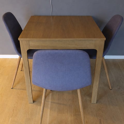 Pent brukt kjøkkenbord, med tilhørende Henriksdal stoler.