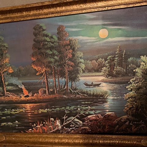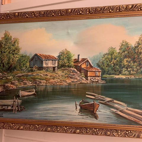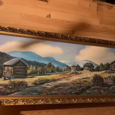 Har fått noen bulker i maleriet, se bilde. Kan være noe skade på ramme. Må hentes, eller kan levere/møtes mellom Hvittingfoss og Sandefjord/Drammen etter avtale. Kom gjerne med bud. Mål: 80x110cm