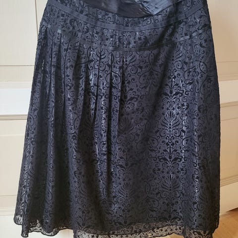 Rory BY NBS fra Custommade. Et sofistikert skjørt i et glitrende stoff. Dette detaljrike plagget er en del av den eksklusive kollenskjonen i samlingen By Numbers. Custommade Rory BY NBS Anthracite Black A fasong. Ktrystallknapper i front Detaljrikt 63% Polyester 47% Metallisk Polyester Rens. Livvidde 80 cm. Lengde forran 66cm, bak 87. Ny pris kr.4500