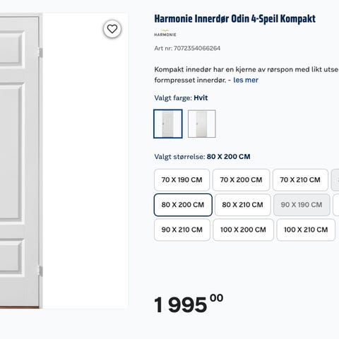 2 Dørblad str. 193,5 x 82,5 cm, karm 1,98 x 89 cm. Lite brukt. 1 dør har små bruksmerker (se bilde). karmsett har større bruksmerker. 2900,- per stikk.