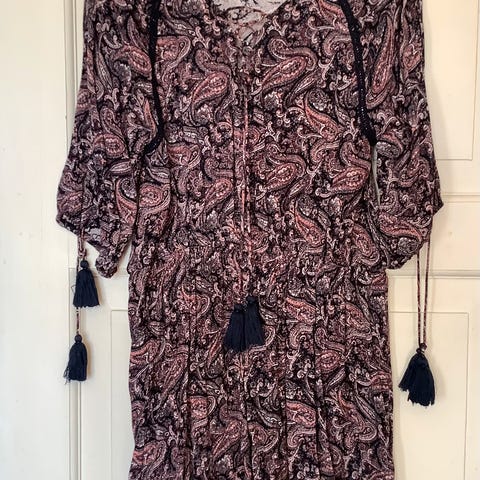 Tunika i flerfarget mønster, strikk og knyting i livet. Vide armer. Kjøpt i New York