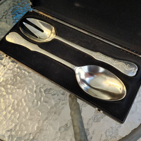 Meget pent brukt salatbestikk fra Holsen Tinn. Selges med original forpakning. Bestikk er meget pent brukt. Noen bruksmerker. 24 cm lange.