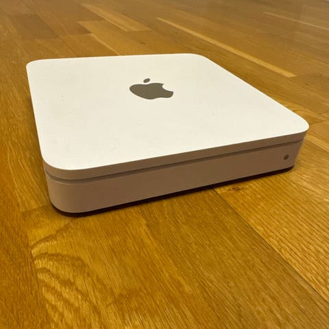 Kompakt Wi-Fi-basestasjon fra Apple, 2. generasjon (modell A1264), lansert i 2008. Dette er siste modell med det klassiske plugg-i-vegg-designet. Perfekt for å utvide nettverk og strømme musikk trådløst til høyttalere via AirPlay.