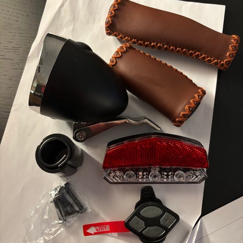 Sykkelutstyr: skjerm, håndtak og ventilhetter