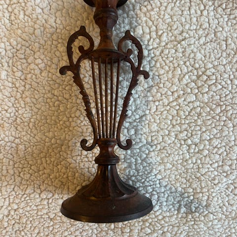 En fin lysestake i tre, rustikk stil med fine utskjæringer. Metallplate på toppen der kubbelyset skal stå. Filt under. Høyde på lysestaken er ca 25cm og platen oppå passer lys inntil ca 8cm. Noen bruksmerker på platen og litt støvete på filten men ellers i fin stand.