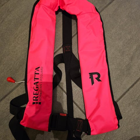 Selvutløsende redningsvest fra Compass for kroppsvekter over 30 kg. Har blitt brukt før, men har aldri blitt utløst. Patronen er inkludert, men må kanskje byttes.