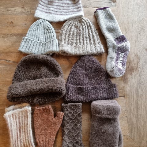 Hjemmestrikkede ull luer og en ull hals - dame