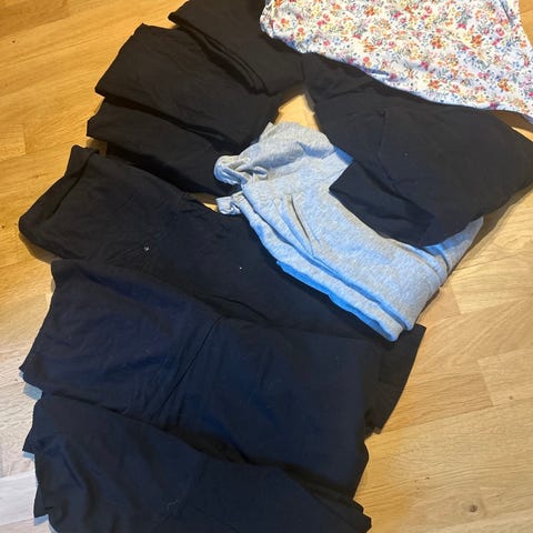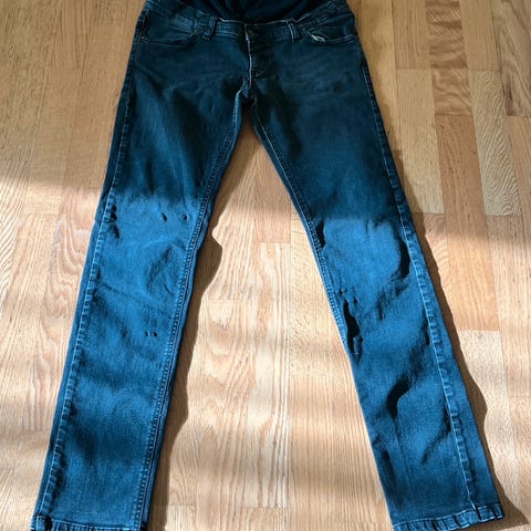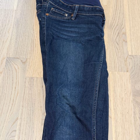 Denimshorts/jeansshorts fra H&M Mama, "Before & after"-kolleksjonen. Lavt liv, med mulighet for å justere midjemålet (se bilde). Fin lengde til litt over kneet.