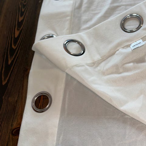 Beige gardiner vevd i fiskebensmønster. Florlette med emaljer for oppheng. Har tre høyder