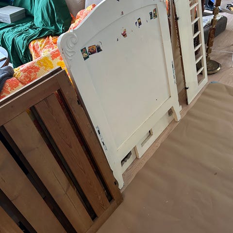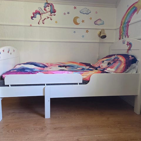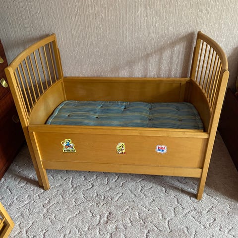 Uttrekkbar barneseng. Den er 83 cm lang. Denne kan trekkes ut og da er den 157 cm lang. Den er 59 cm bred. 67 cm høy opp til sidekanten. Hjemmelaget på begynnelsen av 50-tallet og motivene er håndmalt.