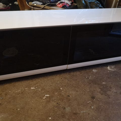 Pent brukt skjenk uten synlige bruksmerker. Farge sort. To romslige skuffer Skyvedører i glass. Belysning i skapene. Meget pen med god lagringsplass. Kan også brukes som Tv-benk.