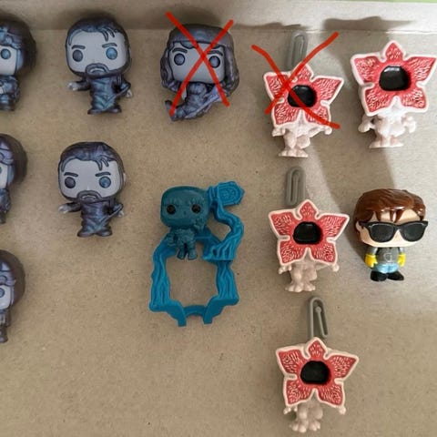 De er 7 og 8 cm lange.Den røde er laget av garn og tøybiter.De er pent brukt og har ikke skader.De koster 50 kr pr stk.De kan hentes hos meg i Oslo eller jeg kan sende dem og kjøper betaler porto.