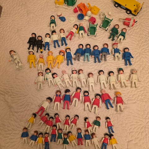 «Retro» Playmobil fra 80-tallet, 173 deler (prøvde å telle), blant annet 31 menneskefigurer og 27 hodeplagg, selges samlet 750kr..