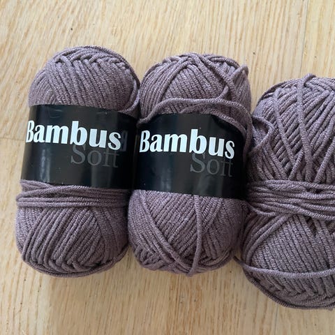 100gr x 7 nøster i tykt, veluraktig bambusgarn selges samlet for kr 250,-. Kan brukes til klær eller interiør (som teppe, pute, puff o.l.).