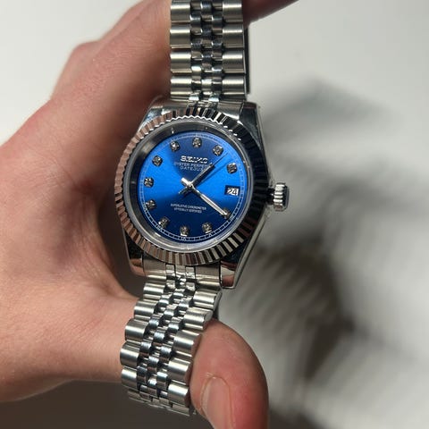 En klokke kjøpt nå i april og brukt ca 10 ganger. Klokken har jubilee lenke (følger med ekstra deler/skruer og skrutrekker i forhold til justering av lengde på klokke lenke) .Det er ingen synlige bruksmerker på den.