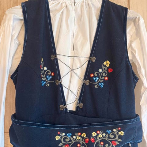 Bomullsskjorte med blondebroderi og sølvfarget knapper. Bærestykke med sølvfarget hempelukning, broderi og fløyelskanting. Stakk i ullkvalitet med broderi i nederkant, samt belte med fløyelskanting og broderi.