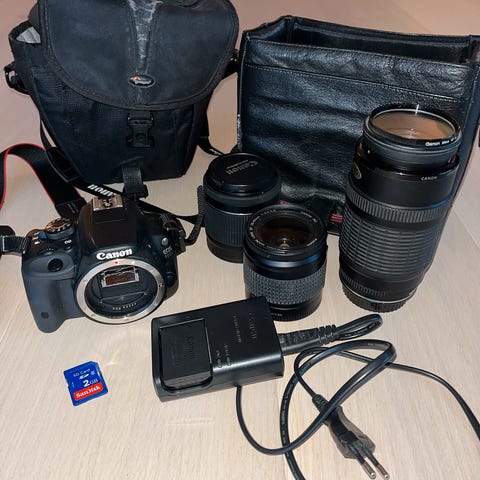 Canon EOS 100D med linse, lader, batterier og minnekort