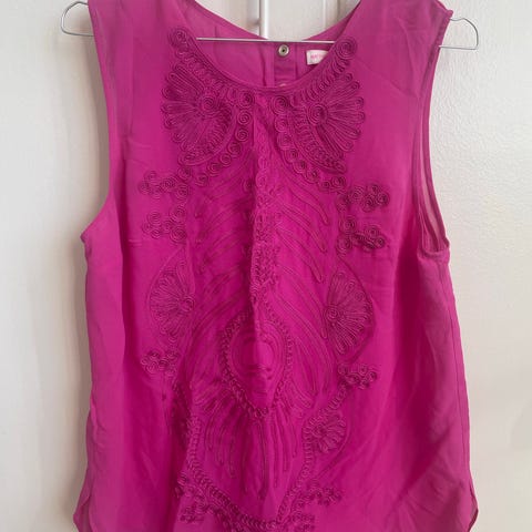 Topp i silke i en nydelig lysblå farge fra Max Volmary. Rund hals og fine detaljer. Den er i 94% silke og 6% elastan, så den har litt stretch. Str 42, men litt liten i str - så er mer en str 40