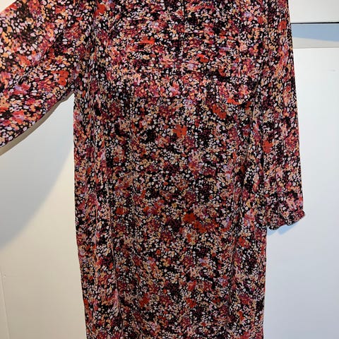 Selger denne hvite blusen med blomstermønster i rosa/rødt/gult/grønt/blått/oransje og sort.