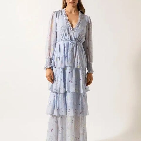 Selger denne nydelige kjolen fra Malina, brukt 1 gang i mai ‘25. Kjolen er lang i modellen, Jeg er 180 cm, hadde flate sko, ellers normal str tilsvarende M.