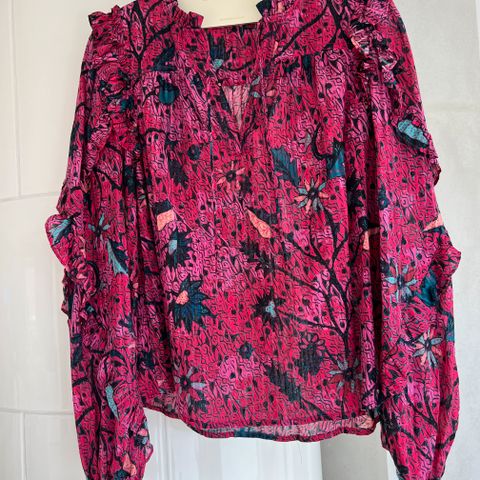 Knall rosa Flowy bluse med rysjer. Skint stoff med skjør av rosa lilla og blått. Drawstring i livet.