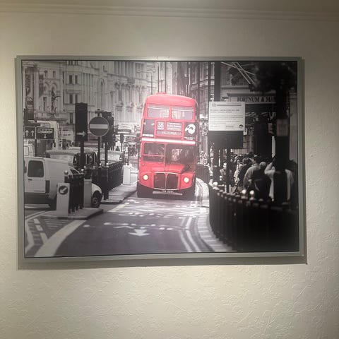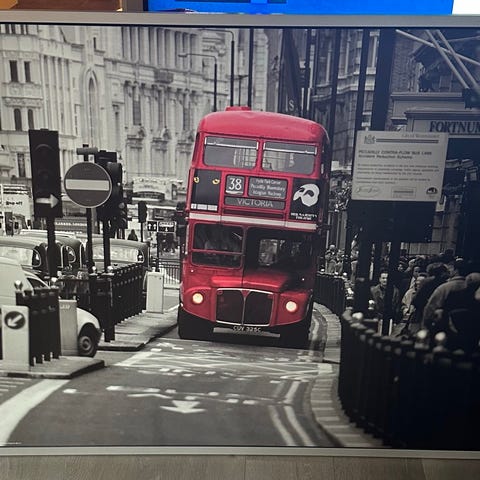 Veggkunst som viser et ikonisk rødt dobbeldekkerbuss i London. Bildet har en svart-hvitt bakgrunn med bussen i farge, og gir et klassisk bymiljø. Passer til dekorasjon i hjem eller kontor.